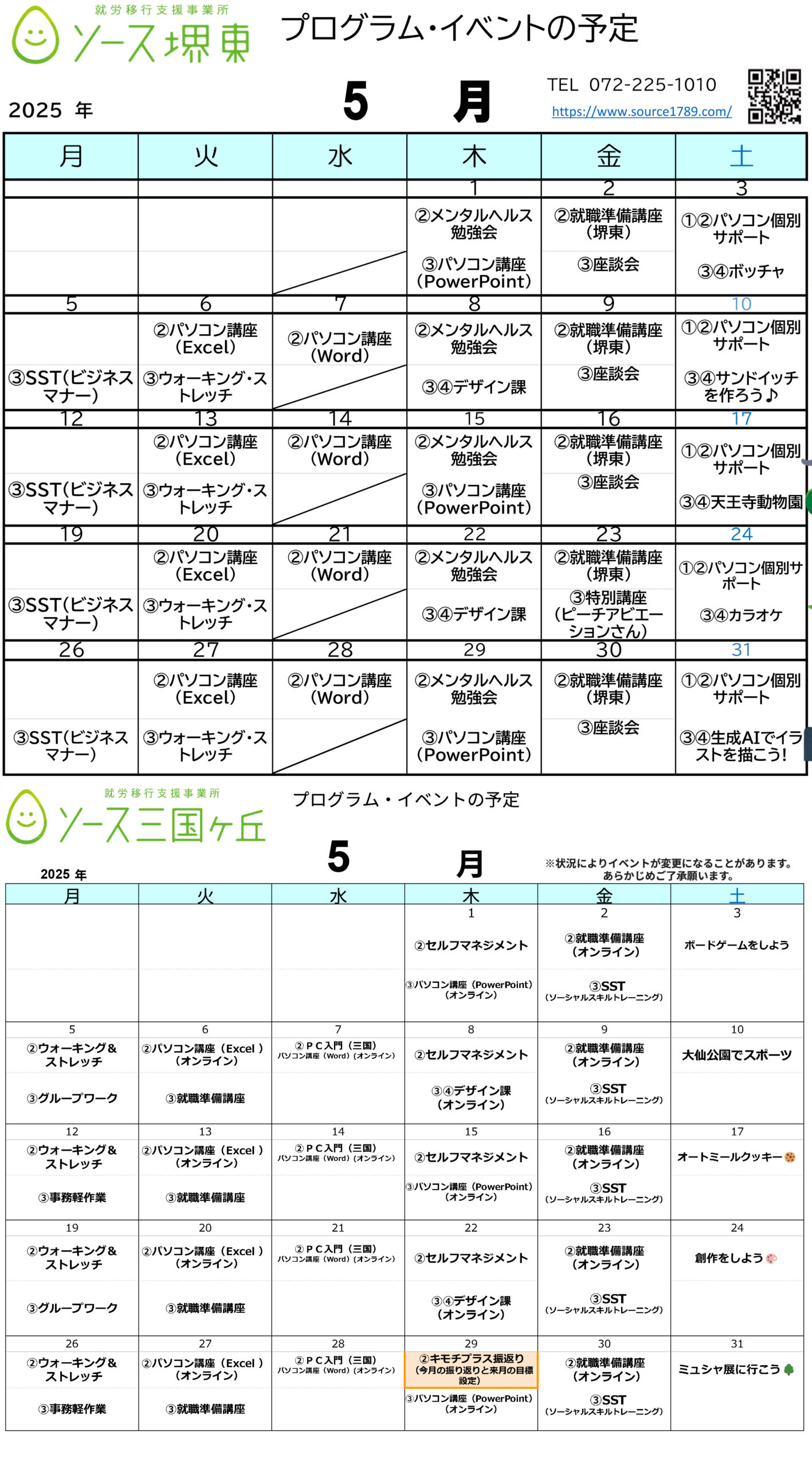 5月の講座・イベントスケジュールです【大阪府の障害者就労移行支援事業所 ソース】