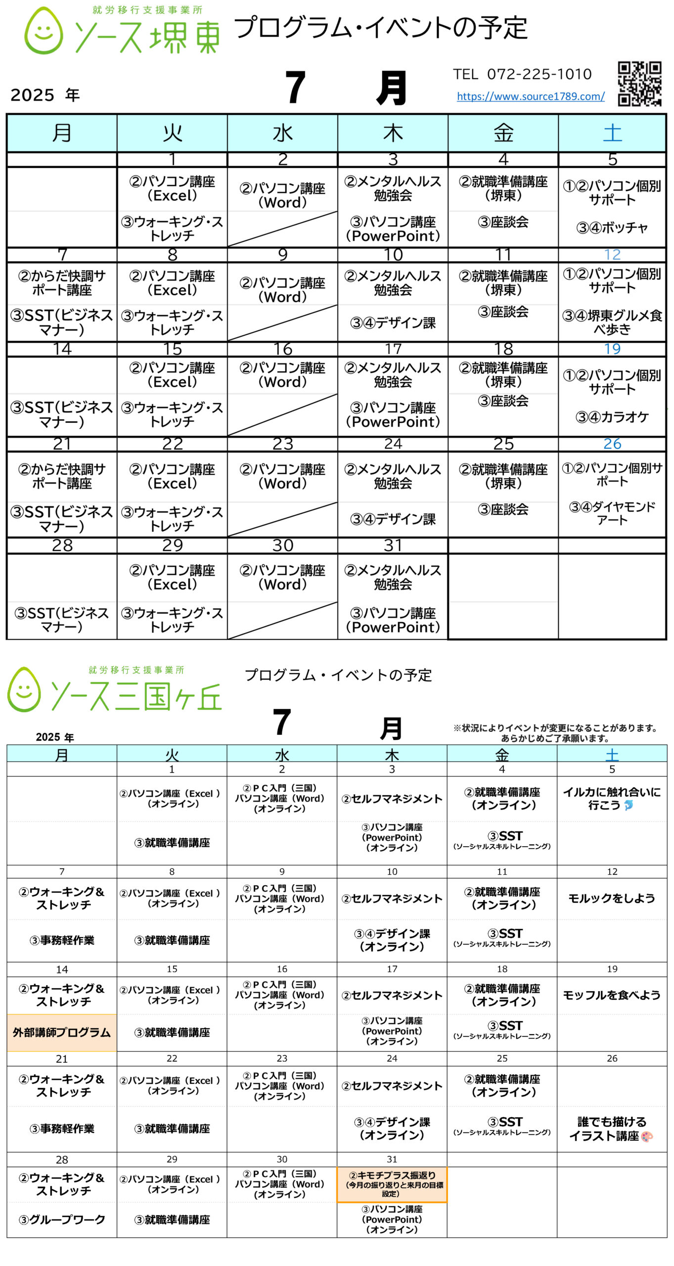 7月の講座・イベントスケジュールです【大阪府の障害者就労移行支援事業所 ソース】