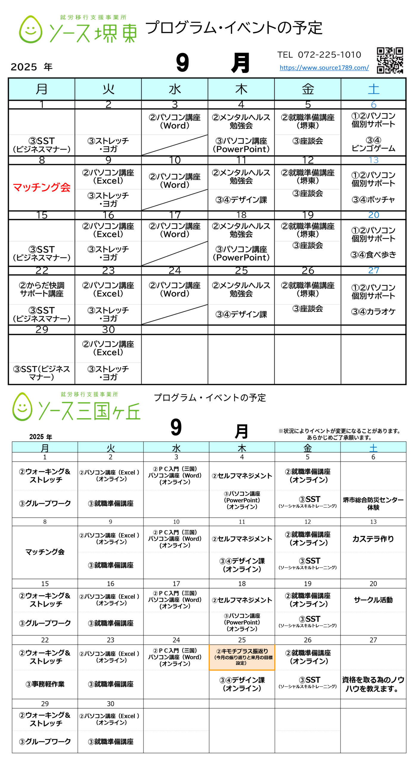 障害者就労移行支援事業所 ソース堺東・三国ヶ丘の来月のスケジュールを公開します。