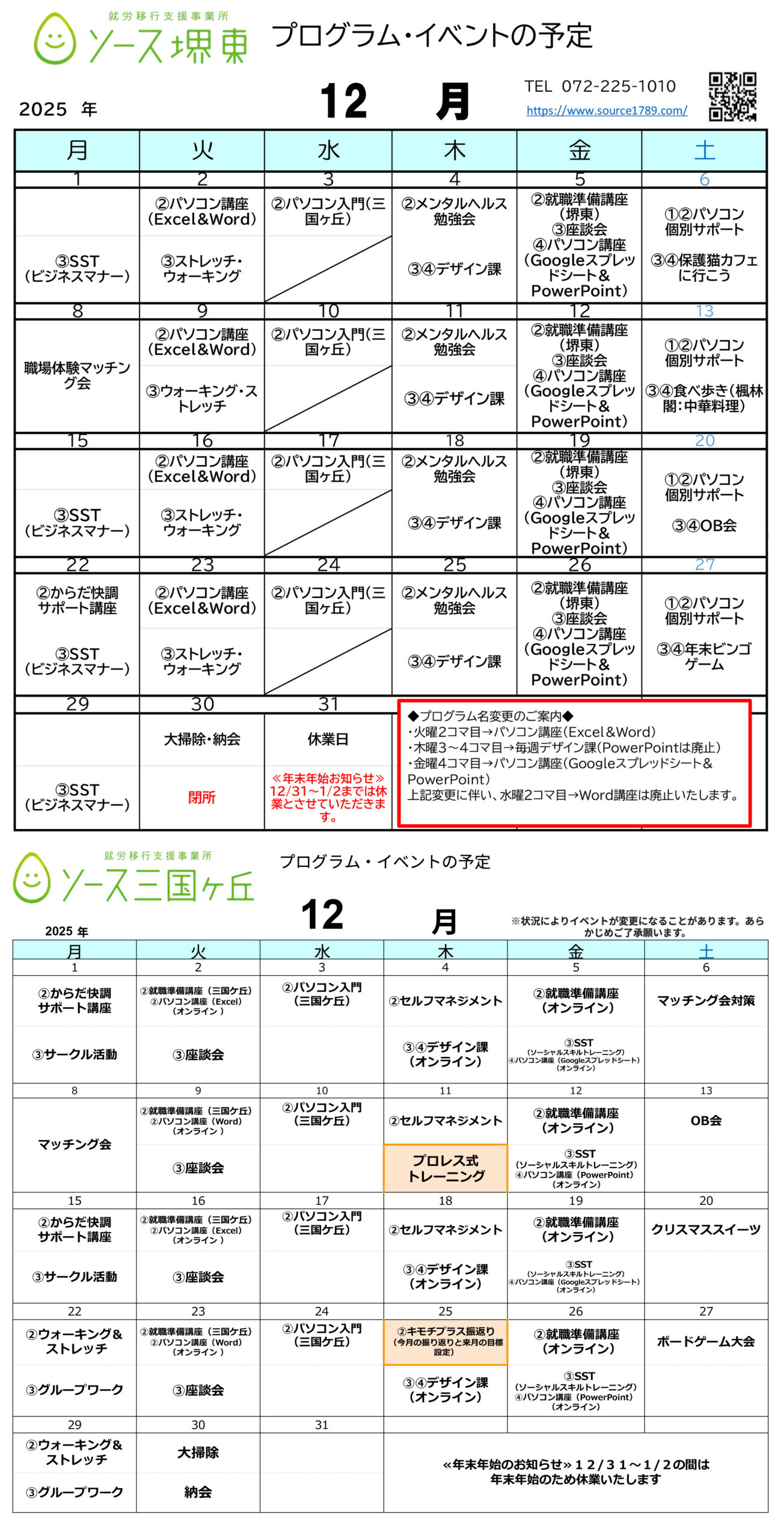 12月の講座・イベントスケジュールです【大阪府の障害者就労移行支援事業所 ソース】
